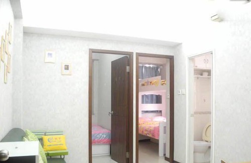 整套公寓户型两房一厅,配一个独立卫生间和一个独立厨房,每个房间都有窗、有空调;其中一房间配置1.5米双人床,另一房间配置标准子母上下床,标准可以入住5人,客厅沙发床可额外增加2人入住,整体不拥挤!