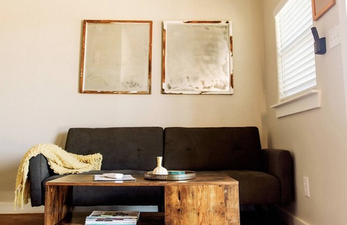 Newly constructed 300 sq ft cottage w/ modern amenities and a industrial theme, quietly nestled on an old farm road on the outskirts of Round Top, TX with KEYLESS entry (no keys to hassle with). The Yellow Rose Cottage was designed for comfort with our guest in mind. Yellow Rose has a full bathroom with a spacious stand-up shower and "on-demand" hot water along with a queen size bed and a futon that can sleep one extra. The kitchenette has a mini fridge/freezer with a Keurig coffee pot and a 2 person table for dining. 4200 sq ft Beer & Wine Garden on premise serving craft and domestic beer along with a variety of wine. Note: We have a total of 5 Cottages on the property for larger parties. Please Contact Eva for more information.