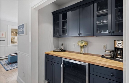 The fully stocked kitchen is perfect for cooking with family and friends, with a grill on the back deck and ample space on the large island. Enjoy meals or a classic Cape Cod clam bake on the back deck or inside at the hand-crafted dining table, both seating 12. The kitchen also has a new dry bar with a wine fridge for extra beverages, and a cozy coffee nook for morning conversations.
