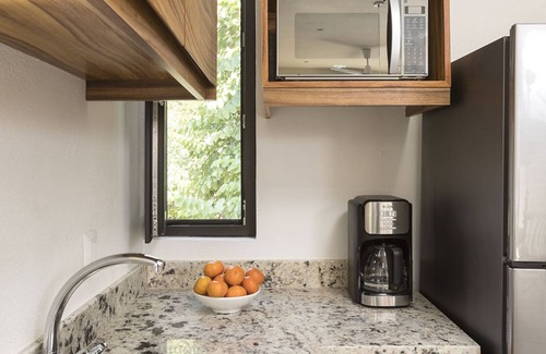 The second story features a bedroom with a King size, memory foam bed, closet with a safety deposit box and a full bathroom. Complimented by an open concept space with a fully equipped kitchen, dining room table and a sofa in the living room. It features a nice balcony to relax.
