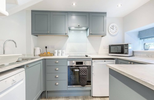 As you arrive, park on your private driveway and step into an inviting porch with thoughtful storage for your belongings. Ahead, a beautifully designed living space greets you, featuring a plush grey sofa that beckons to you after a day of exploration. A wall-mounted TV with a clever pull-out bracket adds to the convenience, while the stylish, smart kitchen with a spacious breakfast bar is a true delight. The kitchen is well-equipped, ensuring all your culinary desires are met. The soft touch drawers and worktop, finished in a harmonious grey and cream colour scheme, create a calming ambiance.