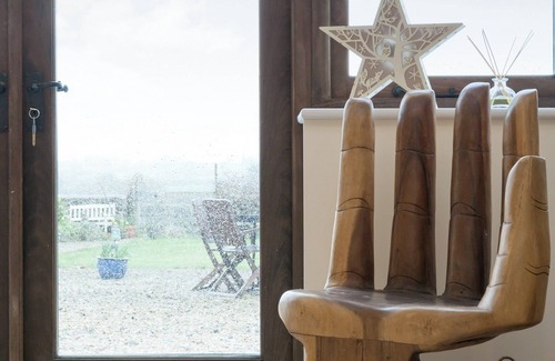 Wet Room: Shower, Toilet. Air source heat pump underfloor central heating, electricity, bed linen, towels and Wi-Fi. Travel cot and highchair. Welcome pack. Enclosed garden with terrace, garden furniture, gas BBQ and firepit. Electric car charging point. Ample parking. Wheelchiair access. No smoking. Please note: Raised fountain in the garden. Unfenced stream in the lower orchard, open duck pond in the fenced upper orchard, and unfenced pond in the private Longbarn garden. . Longview is a contemporary extension on the side of a converted 17th century Longbarn. The wheelchair accessible property enjoys 20 metres of double glazed windows that provide a luscious panorama across the croquet lawn and surrounding flower and shrub beds, with 400+ apple trees in the orchard below and open fields for miles beyond; it is everyone’s favourite aspect. The accommodation has its own access road and disabled access parking with separate entrance so you can come and go as you wish. There is also a wheelchair-friendly wet room. The property is equipped with a sustainable air source heat pump underfloor heating system that provides a comfortable ambience.