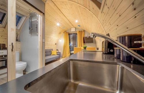 This superb quirky and well designed mega pod provides everything you need to enjoy a relaxing break either as a couple or small family. There is one king-sized bedroom sleeping two which also has a 32" Smart TV, wardrobe, dressing table and two bedside shelving units. Additional sleeping can be found in the living area where there is a small double sofa bed that sleeps two children. The open-plan living, dining and kitchen area has everything required to make the most of the space provided, with a wall mounted 32" Smart TV, Bluetooth speaker system and USB sockets throughout you’ll not be short of ways to entertain, especially with the kitchen providing a 2-ring induction hob, microwave/oven combi, fridge and small freezer and sink.