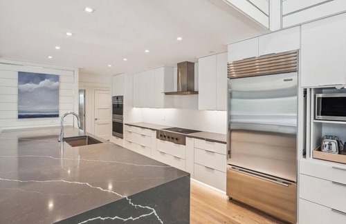 This spacious 6-bedroom, 6.5-bathroom second row ocean vacation home is stunning on the inside and out with luxury finishes, beautiful artwork and is within a short walking distance to the beach. The yard is full of lush landscaping as you walk up the partially covered walkway to the main entrance. Inside you’ll first notice the light hardwood floors throughout and the open concept living area. The living room is in the center of the home and has cathedral ceilings, a blue sectional couch, two gray swivel chairs, a mounted 75” TV over the fireplace surrounded by built-in bookcases that has books and games for your enjoyment. Behind the living room is the fully equipped kitchen with gray, granite countertops, stainless steel appliances including a Sub-Zero refrigerator, a 5-burner Wolf gas stove and two ovens. This gourmet kitchen is sure to please the chef in your family! There are six stools at the countertop – a great place to enjoy an appetizer while watching the chef prepare your meal. The adjacent dining room has a large wooden table that seats 10 and has a dry bar with mini fridge. The sliding door opens to a small balcony that overlooks the back yard.