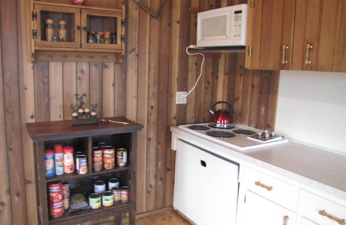Trapper's Cabin is perfect for a couple or a family. Economically priced at $250.00 (not including taxes. GST and Hotel Tax add 9% to the rental price) per night for up to four people. (over four people is $20.00 per extra person per night plus tax.) It has three double beds and two double bed mattresses in the loft. It has a kitchen, bathroom, dining area and a fantastic view. If extra beds are needed there are R.V. rentals available also that can be brought to the site for you near the cabin. Tents can also be put up on the land. (25.00 per tent per night) Bedding and towels are provided and the furnished kitchen is great for cooking your own meals. It is set in a very private beautiful treed area yet only 5 minutes from the main highway. Goose Island Pond is right out the front windows and is frequented by Canadian Geese, Loons and Beavers. It has a heritage theme with the area's legendary characters pictures and histories on the walls. Truly a unique and pleasant experience. There is a large beautiful fisherman's lake just down the hill (Payne Lake) and the hamlet of Mountain View is only 4 km east where food and gas can be purchased. You will also enjoy the array of wild flowers on the grassy hills beside the cabin. There is also a 2 km hike that can be taken up to Little Beaver Lake near by. Of course Waterton National Park is a must see and offers horse rides, boat rides, restaurants, mountain trails, vast lakes and fantastic wild flowers and wild life to enjoy. The townsite of Waterton is only 20 minutes away.