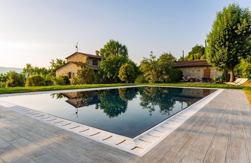 This property is a portion of a beautiful Villa in Todi (Umbria). The house was built in 2006, over the remains and in the style of a historical farm. The pool was added in 2018. Only 50 meters from the medieval walls of the town. It stands at the Center of an estate featuring aged oaks, walnut trees, olive trees, and fruit orchards.