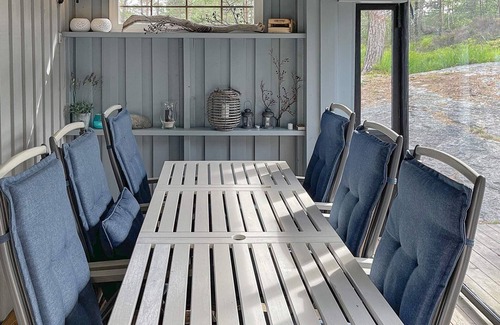 Nice holiday home located in the forest Buerskogen by Halden. The holiday house has a dining room with space for 12, kitchen, hallway, toilet with sink, bathroom with sink, shower and combined washing machine/dryer. Living room with sofa, TV and fireplace. WiFi and Streaming TV. One bedroom with two bunk beds and one with a double bed. As an extension of the dining room, there is a veranda with morning sun and an awning. There is plenty of wood in the wood shed behind the cabin to use for a fireplace or bonfire. There is also a heating fan in the cabin which can be used for heating in winter and cooling in summer. There is an annex on the plot which is also insulated for winter. The annex consists of a main room with a family bunk for 3, sofa and TV, as well as a room with a raise and lower bed. Panel oven in both rooms. There is a built-in veranda in front of the cabin with large sliding plexiglass doors with which you can seal off the entire front, and in spring and summer enjoy outdoor mornings and evenings regardless of the weather. It is also on this side that the sun sets and provides wonderful light. Tables and chairs for six people, more chairs at the table by the annex. Heating element under the roof. The house is not rented out to youth groups. In front of the annex, there is a large patio on two levels. Here it is sunny from morning to evening and a great meeting point for everyone in the warm season. Six adjustable sitting/lounge chairs and a hammock. The forest is the nearest hub, with caves, gorges and ponds, and great play opportunities. The cabin is located on a peak five minutes from the lake Ørsjøen with three beaches. The main beach is below Buerskogen camping with piers and a raft. The campsite has a playground with trampolines. Those of the guests who have dogs are asked not to have dogs on furniture and must vacuum extra well after themselves, even if cleaning has been ordered. Linen rental including towels for use inside. A canoe for 2 adults and two children and a children's kayak (can also be used by an adult) free of charge. At the pump house on the beach are the canoes and kayaks locked with a chain; the key is included in the package you receive upon arrival. The boats are included in the rent. Four life jackets from 7 years and up to adults. Inflatable rubber boat with oars. Two BMx bikes suitable for both children and adults. In winter, the frozen lake is a great for ice-skating. Located 200 m from holiday home 48917 and 250 m from 54294.