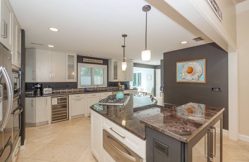 The expansive open floor plan living area offers two distinct living spaces, separated by a stunning centerpiece fireplace. A chic dining area is thoughtfully positioned in this modern layout. The kitchen has been impeccably updated, featuring a spacious design and top-of-the-line appliances. An office nook adjacent to the kitchen is the ideal spot for those who need to attend to business matters even while on vacation.