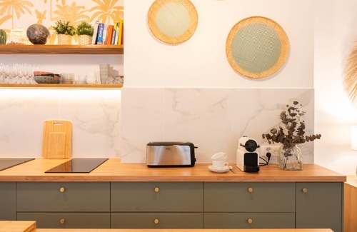 The two bedrooms have AC, king sized beds, and closets. The two bathrooms are spacious and modern. The kitchen is open on the spacious living room, it is fully equipped to allow you to cook delicious french meals.