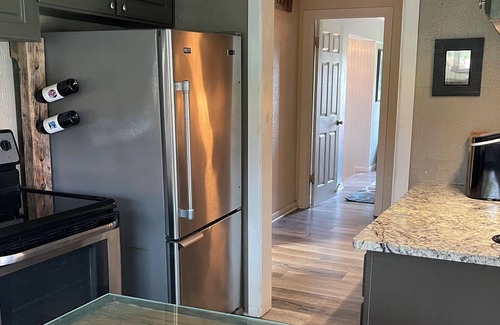 The Farmhouse is fully furnished with central heat/air, large TVs in the living room and bedrooms, free wifi, kitchen, washer/dryer and drip coffee maker. There are lots of windows with beautiful views of the ranch and cattle, and an antique wood burning stove in the living room. There is a bedroom with a king size bed with half bath, and another bedroom with a full size bed, and another full bathroom. The bedrooms have nice linens and ceiling fans. The kitchen is a full kitchen with refrigerator/freezer, electric range and dishwasher.