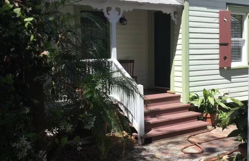 The entrance to the Cottage is the original historic shotgun hallway that leads to the small back porch. The Cottage while small is ideal for a single guest or a couple. One bedroom with queen size bed, full bath with walk in shower, full size kitchen with stove, refrigerator, microwave, toaster and coffee maker, and living room with TV and WiFi. The Cottage has a comfortable couch and table and chairs for sit down dining. Please review all of the photos so that you will be familiar with all of the amenities.