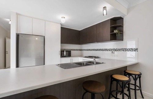 Kitchen has a fridge/freezer, gas cooktop, microwave, oven, dishwasher, coffee machine.