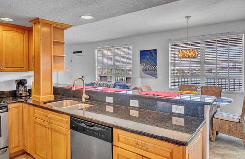 UNBSTRUCTED WATER VIEWS JUST 2 BLOCKS FROM THE BEACH! This condo’s updated coastal zen decor and amazing on-site amenities make it a gold mine for retreats! The condo interior spans from front to back of building making it light and bright. Experience unobstructed East-facing intra-coastal views and sunrises from kitchen, dining and living areas through the condo's large wall of windows. West sunset views can also be seen from both the master and guest bedroom. The living room is spacious and has a pull-out couch making this home comfy enough for 6. Coastal color pallet throughout with ceramic tile flooring in the kitchen, baths and common areas and whitewashed wood floors in both bedrooms (no carpet!). Kitchen has stainless steel appliances, wood cabinets, granite counters and breakfast bar with stools. Dining area opens up to kitchen and living area making entertaining a breeze. Both bedrooms have king beds, spacious closets and bathrooms right outside the door (one with a step in shower and one with a tub/shower). Just off the kitchen, in laundry closet you’ll find a full sized washer and dryer. Covered/shared balcony area on the Intra-coastal side provides access from elevator to all units and lots of space for lounging. Recent updates include some new furnishings and decor, newer A/C (2019), newer front door with all new locks and keyless entry. Amazing amenities include use of heated waterfront pool, sun deck, fishing dock, lounging bogota, grill area, paddle board/ kyack storage, bike racks, plenty of under building parking spots and also uncovered spots available (1st come 1st serve). Roku available on all 3 tv’s (new 2025) and full internet access also provided. This property is located 2 blocks from one of Florida’s most pristine gulf front beaches! Fine dining, beach bars, shopping all within a few blocks from your front door.
