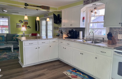 Undeniably adorable, Latitude Adjustment Beach House is a celebration of authentic coastal North Carolina cottage-style island living. Located on Pleasure Island, home to Kure and Carolina Beach, the house has been lovingly decorated with nostalgic beachy charm and a touch of Caribbean flair. Latitude Adjustment offers a relaxing coastal experience where visitors may enjoy warm summer afternoons with friends and family. Located a block from the beach, a lazy, 28 second stroll finds your feet in the sand as you take in the spectacular views of the Atlantic ocean. Just 20 minutes from Wilmington, this seaside cottage features 2 bedrooms and 1 bath for the perfect beach getaway.