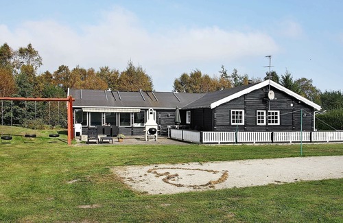 Holiday cottage with swimming pool, whirlpool and sauna, and outdoor activities like petanque. There is an extra TV with X-box and DVD-player in one of the bedrooms. From the living room you can watch the 60 m² large pool room, which has plenty of floor space with tables and chairs. Enjoy the 18 m² large swimming pool, which is always heated no matter time of the year. If you would really like to relax, go for a good sweat in the sauna or use the whirlpool for 4 people. There is an activity room with exercise bike, rowing machine and a step machine. The well-equipped and functional kitchen offers cutlery for 36 people. It is combined with a 60 m² large living room and acts as the centre of the house. With its skylights the whole room is bright and welcoming. The house is allergy friendly as all carpets have been replaced with wooden floors. The house is surrounded by a 140 m² large wooden terrace, where you can enjoy a lovely barbecue night. There are swings and sandbox on the property. 2 cots, 2 high chairs and double carport at your disposal. There is an 18-course golf course nearby, from where you have a great view of the fjord and Kattegat. 50-100 metres away there is a Put and Take lake, mini-golf, grocer's and restaurant.
