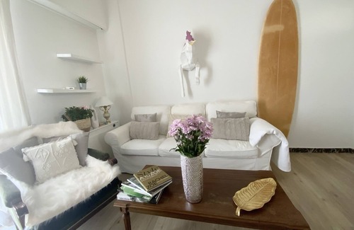 This is a very special big modern Maison d’ artiste with beautiful bright white surroundings and curated layers for pleasant, cozy staying, vacaytioning and work from home. A very fresh and big open design working/ gathering space with a cushy, relaxing living space with a sculptured fireplace and lounge patio! This is a detached building with an independent access, a ground floor reception and an upstairs space of 150 sqM. The house is 10 minutes driving away to Athens Riviera and to the Athens City Center, placed ideally in the middle. The space is a beautiful artistic and vast live/work space! A very fresh and modern large working space and a cozy, let back and relax living area. It used to be my family’s art studio, and has a creative luminous atmosphere all around! It’s freshly renovated and restored, fully equipped, inverter A+++ air-conditioning in every room, 55” smart tv, full equipped kitchen, one bathroom with bathtub, one toilet, balconies all around the house as it is on a corner and a lounge balcony area at the master bedroom. It’s bright, sunlit, spacious with high ceilings, filled with lovely little touches, perfect for couples, friends or a family!