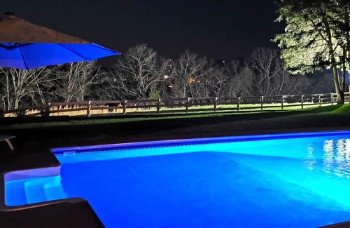 A "Jimmy Buffet Key West" 20 x 40 heated salt water pool complex with a PRIVATE HIIGH END JACUZZI FOR EACH COTTAGE a large grill with side burner, two large bars, pavilion, indoor/outdoor showers, bathroom/changing room, multiple outdoor games, two fire pit, two double hammocks and mountain/pasture views with complete privacy to enjoy the area. Most times it will be only you at the pool area. It is a working farm so there will be help around the farm to keep it well groomed for visitors.