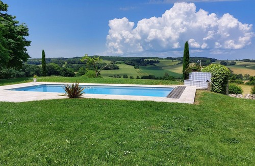 18C character house with fireplace, exposed beams and beautiful structures in the rooms. Enjoy the charm of thick stone walls and ancient beams. The large building on the side of hills isolated and independent is located at the end of a road in the countryside in the middle of sunflower fields away from the stress and bustle ensuring peace and quiet. The pool 11m x 5m surrounded by a wide beach where you take sun baths in a wonderful countryside views. Its south orientation will ensure water at 28 ° C in high season. The terrace due west facing open views you can enjoy the sunsets. Its park and its stone well provide shade and coolness. The spacious house has 5 large bedrooms of 25 m2 each, 2 bathrooms + 1 shower, 2 lounges with fireplaces, a dining room and a kitchen. No neighbors, this is a peaceful haven amid the rural countryside! You will be less than 4 km from the village of La Romieu equipped with a grocery store, a bakery, a newsagent and some restaurants, village ranked among the most beautiful villages in France. Contact: lepinepatrick @ orange. fr