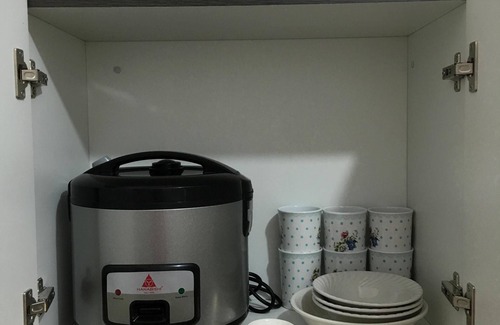 - Fridge, rice cooker, frying pan, sauce pan, cups, mugs, spoon and fork, strainer, knife, can opener, chopping board, plate, bowl.