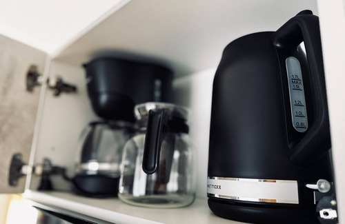 The kitchen is equipped with a refrigerator, as well as a coffee maker, a microwave, and a toaster. And you won't have to pack extra clothes, because you'll also have access to laundry facilities.