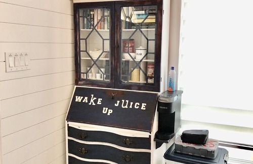 Coastal Charm is a 2 bedroom, 2 bathroom beach house. Built by us, for us, that we share with you. There are a lot of our personal touches throughout the house, it’s not a purpose built rental. If you see it listed for the weekend you want, book it quick! Coastal Charm is a 1960’s bungalow reimagined. Vaulted ceilings throughout make it feel grand in a petite package. The master bedroom features a grand king sized bed, with an elegant claw foot tub and sink with a toilet room. A chandelier in the bath area provides a nice touch. The second bedroom features a queen size bed with 2 twin XL beds for the kids. There is another twin that can be lowered from the wall if needed for more sleeping arrangements. The hall bathroom has a stand up shower, toilet, sink and a hidden away washer and dryer, should you need it during your stay. The kitchen is open to the living room and dining area. There is a cooktop and a convection oven/microwave. The dining room table is setup for 4, but there is a leaf to expand it if needed. Living room features 2 couches for relaxing after a day at the beach. Outside, there is plenty of seating around the 180 degree deck, with deck chairs on the south side for tanning away from the sand, and sitting areas on the other 2 sides to enjoy the multiple views off the deck in every direction. You can see the gulf and jetty from the deck, and it’s always a thrill to watch the ships come in and out of the jetty. Downstairs is a large shaded area under the house with several seating areas so you can always find a breeze and some shade. There is a fire pit surrounded by adirondack chairs along with a large picnic table, and there is also seating towards the back yard. The yard is fully fenced, front and back, to keep the children or pets in. It is a great area to chill and relax anytime of the day. There is an outdoor shower, which is great for rinsing off all the sand and sweat from the beach, but in reality, it’s our favorite place to shower in the spring, summer, and fall.
