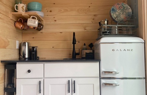 Full kitchen and full bathroom are in the separate structure steps away from Dome structure. Kitchen has a door-mounted table that folds down with four foldable chairs. Luxurious and tiny at roughly 120 sq ft.