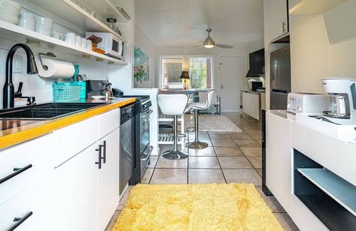 Updated, full resort kitchen with high-gloss cabinets, Acacia wood countertop and 6' long sideboard for additional small appliances and kitchen items.