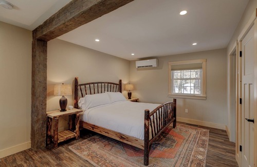 One of eleven luxury rooms at the Lodge by Sunapee Stays, nestled in Sunapee with spectacular views of Mount Sunapee just out your front door. This modern rustic two level suite features 2 bedrooms, 2 bathrooms and a sofa bed. The hickory log furniture, shiplap vaulted ceilings and plush Adirondack style furnishings evoke relaxation after your day of adventures. The bathrooms boasts a sanctuary of their own with pebble stone shower surrounded by subway tiles and your very own bidet toilet! On the first floor, this suite offers one bedroom with king bed, smart TV and ensuite bathroom. On the second floor, you'll find an additional bedroom with king bed and second full bathroom. The living area offers a sofa bed and smart TV and the kitchenette is fully stocked with all the amenities to eat in. This suite offers a semi private deck with stunning views of Mount Sunapee along with an in suite washer and dryer. Later this winter, the Lodge will offer a common indoor lounge area featuring contemporary and classic family games along with a TV. In the summer, enjoy the seasonal outdoor pool with cabana and outdoor space.