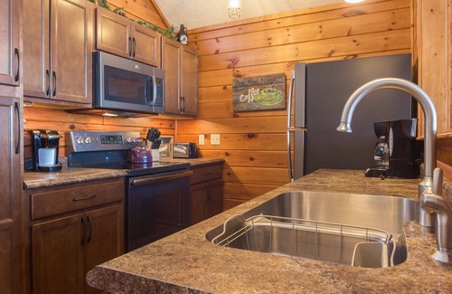 When you enter the cabin the first thing you see is a wall of windows with an incredible view of the valley and mountains in the distance. At night, the lights of Sevierville twinkle and glow like hundreds of lightening bugs! To your left is a completely remodeled kitchen with stainless appliances, new cabinets and countertops. We have added a pantry for additional storage. The kitchen is fully equipped with a variety of small appliances including a regular and single serve coffee pot, crock pot and blender. To the right is the dining area with table and chairs - seating for 4 (there is an additional bench in the bedroom if you need extra seating). The full size stackable washer and dryer are just behind the door in the dining area.