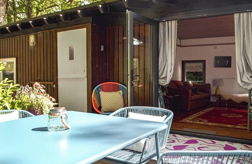 Shower Room: Cubicle Shower, Heated Towel Rail, Toilet. Electric heating, electricity, bed linen, towels and Wi-Fi included. Decking with garden furniture. Children’s play area and playing field (shared with other properties on site). Outdoor heated swimming pool (shared with other properties on-site, 30m x 15m, depth 1.2m x 1.6m, open early May-end of August). Private parking for 2 cars. No smoking. Please note: There are 2 steps to the decking.. Come and uncover the delights of The Cabin nestled in a quiet, green corner of Penlan Holiday Village, a relaxing, wooded holiday park near Cenarth. Here you will find this charming Scandinavian-style log cabin, alongside native trees and the sound of birdsong. As you approach The Cabin, you are greeted by a quaint wooden exterior, featuring a sloping roof and large windows that allow plenty of natural light to flood in. The French doors to the cabin open up to a cosy but spacious living and dining area, decorated in vintage Scandi style, where a comfortable sofa and dining table are arranged with views out onto the large decked terrace with garden furniture and pots filled with seasonal flowers.