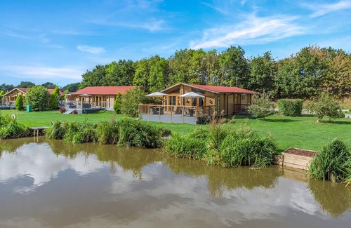 Stunningly designed contemporary lodge with one double with dressing room and en suite bath with overhead shower, one twin with en suite wet room, both with flatscreen TV. Well equipped state of the art galley kitchen with wine cooler and dishwasher. Open plan lounge/dining area with French doors leading out onto a spacious verandah with garden furniture, barbecue area and outdoor hot tub in enclosed gazebo overlooking the woods. 70" smart TV in the lounge, guests to sign in on their own account. Ideal for couples or families. No pets.. Nestled peacefully in the wonderful Shropshire countryside, this exclusive cluster of luxury lodges offers the perfect escape for couples or families looking to kick back and relax in an idyllic location. Situated within close proximity Ellesmere, home to its glistening mere and traditional country pubs, each accommodation has been carefully positioned next to a shimmering fishing lake offering all the home comforts of modern day living, complemented by superb design and rustic features, while hot tubs offer the ultimate way to soak up the wonderful ambience whilst marveling at the starry sky.