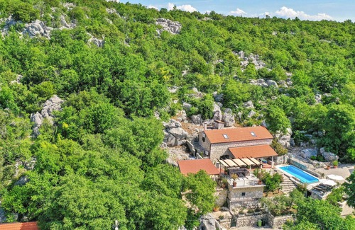 This secluded vacation home near Vrgorac enjoys a hilly location not far from the border with Bosnia and Herzegovina. This charming stone house from 1865 has been completely renovated, but the traditional style has been retained. The vacation home with pool extends over two floors, with the pitched roof reaching 160 cm in the attic. You can refresh yourself in the pool in front of the house, spend wonderful moments with your loved ones on the covered terrace, relax in the hot tub, prepare delicious barbecue dishes and enjoy the view of the Biokovo Mountains. Explore the surroundings and enjoy the unspoiled nature while the children have fun playing table soccer or darts.