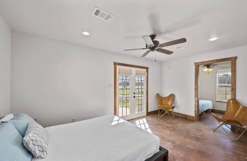 Come enjoy nature surrounded by huge oak trees🌳 & stocked pond 🎣 with brand new PARTY BARN with pool table, ping pong & giant yard games!