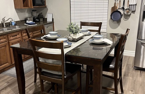 About the Suite: This commodious 2BR/1 BA suite is a private in-law basement unit, beautifully appointed, and thoughtfully designed for your comfort. Accommodating up to 6-8 people, the suite features 2 comfortable queen bedrooms a murphy bed, and a pull-out sofa bed The small kitchen is fully equipped for preparing hearty meals, and you'll have free WIFI, a large reclining sofa, and a 75’’ TV for entertainment. This space also includes a full-sized pool table. Plus, enjoy exclusive access to a hot tub in the backyard.