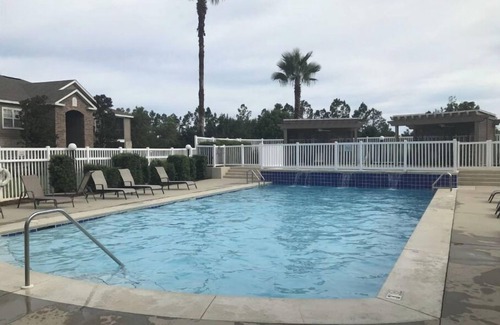 Welcome to my Beautiful Beach theme Condo without the Beach prices This Condo is a Beautifully Decorated Ground Floor Condo located just off Hwy 59.in Foley Alabama Close To OWA, The New Tropic Falls Indoor Water Park. Foley Sports Tourism Complex, Foley Sports Plex Tanger Outlet Mall, GlenLakes Golf Club, Gulf Links Golf Center, Lamberts Restaurant (Home of the Throwed Roll), Cracker Barrel, Applebee's, Shrimp Basket, Wolf Bay Lodge along many other Great Family Restaurants. You will also find a Wal-Mart and a Publix less than a block away and a very short drive to Gulf Shores Beautiful White Sandy Beaches This Condo Has been newly Renovated and Tastefully decorated with a Beach and Costal theme. This Condo is Fully Furnished and is Very Comfortable (I use it myself not just a rental) . The Master Bedroom features A King Size bed with a 3-inch Sweet Dreams Mattress topper and an En suite Bathroom inside the Master Bedroom, plus a 40-inch TV , Ceiling fan and a Large walk-in closet, The secondary bedroom Features 2 Pillow top Full-size beds Plus a 40-inch TV, Ceiling Fan and a large walk-in closet The Den Features a Palm leaf ceiling fan, A 58 Inch Smart TV That is Roku ready so you can log in to your account and watch your favorite programs and features an awesome cable package and WIFI which is included with your stay, The Condo also features A full Kitchen with a separate dining area. All kitchen utensils are furnished, A new Built in Microwave, Glass Top Stove, Garbage Disposal and a built-in dishwasher with a guest starter pack furnished. The laundry room Features an Extra-Large Washer and Dryer with a guest starter pack furnished This Condo also has a screened in porch patio area to relax and enjoy your mornings or your favorite cup of coffee. The Condo Complex offers A Large Swimming pool area with palm trees with a very relaxing atmosphere and plenty of free parking. So, if you are beachcomber, A Golfer, A shopper, A Fisherman or if you just want to relax by the pool this Beautiful Condo and has something for everyone.