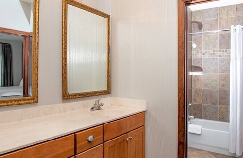 This spacious two-bedroom resort Suite measures approximately 1,226 square feet. You will enjoy a king bed in the primary bedroom, two double beds in the guest bedroom and one queen sleeper sofa in the living room. Additional amenities include a full kitchen and dining area, balcony, fireplace, two bathrooms, whirlpool tub and washer/dryer. Maximum occupancy is eight. Private sleeping area sleeps six.