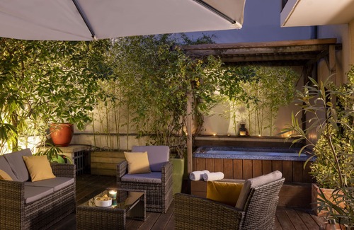+ PRIVATE TERRACE, 42sqm/452sqft, with Hot Tub, outdoor dining table and sofas. After a long day visiting Paris take time to enjoy a cocktail and relax in the hot tub, a real treat!