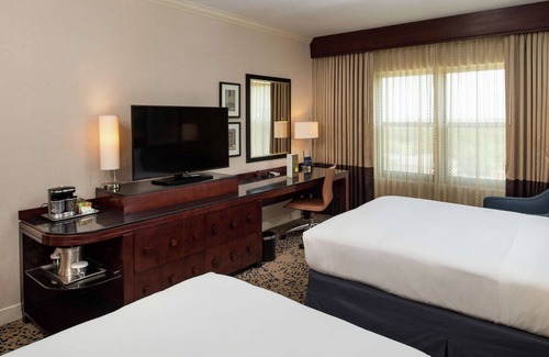 Deep soothing hues and warm décor welcome guests of the 1 King Bed 1 Bedroom Suite. Unwind in the living room furnished with a sofabed and armchair, or accomplish last-minute tasks at the large desk. Soothe your stress away in the bathroom that features a jetted tub, glass-enclosed walk-in rain shower, double marble vanity and luxurious bath products. Sleep soundly in the separate bedroom on a plush King-sized bed with allergen-free pillows. This 530-square-foot retreat is ideal for leisure or business travelers looking for a one-bedroom suite in San Antonio. Boasting resort-style amenities and modern accommodations, the hotel offers a convenient location on the west side of the city close to several popular attractions. Take time to relax in one of the three outdoor pools, make s'mores around the firepit, or end your evening with an outdoor movie and a view of the nearby SeaWorld fireworks by the pool. During your stay, you can enjoy breakfast at Hill Country Café, savor local cuisine at Spur Texas Kitchen & Bar, and pick up fresh meals to go at Fresh Connection. The hotel is located just one mile from SeaWorld and Aquatica San Antonio, to which complimentary shuttle service is provided, and a 20-minute drive from both downtown San Antonio and the San Antonio International Airport.