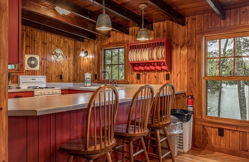 Cardinal Cabin is a breathtaking 3 season cabin with 2 bedrooms, a full bathroom and additional sleeping accommodations in a coy loft. Easily accommodating up to 6 guests, the cabin glows with natural light with cathedral ceilings in the living room providing a spacious, relaxing area to gather with family and friends. The kitchen is fully appointed with counter seating and everything you’ll need to entertain during your vacation. Relax in comfort on the private patio after a long day of enjoying the property’s sandy and private dock. Secure your watercraft safely or fish right off the dock while enjoying the eagles soaring overhead. End the perfect Northwoods day around the fire pit, or picnic under the stars along the lakefront.