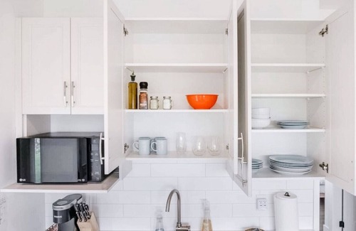 ☀ In our well-equipped KITCHENETTE, you'll find everything you need for light meal preparation, including a kettle, toaster, microwave, and induction burner. Plus, step out onto the patio to find a natural gas BBQ with a side burner for outdoor cooking. Please note that there is no oven or stove top in the kitchenette.