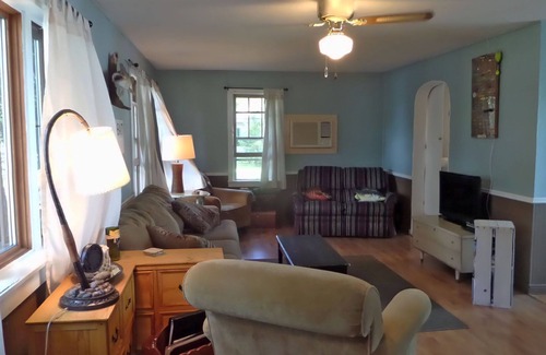 The home features four bedrooms, two bathrooms, a living room, dining room, rumpus room (with foos-ball table, electronic dart board, video games, and board games), eat-in kitchen, deck, two patio doors right on the lake, all on two-thirds of an acre. There are seven beds that will sleep up to ten people plus a futon and roll-out couch in this 1,600 square foot home. The kitchen has plenty of counter space and there is a washer and dryer. We have a flat screen TV, high-speed internet, and Amazon Firestick. If you have a Netflix account you can log in on the TV). You can bring up dogs if you'd like (if housebroken). If you don't like doing dishes there is also a brand-new dishwasher.