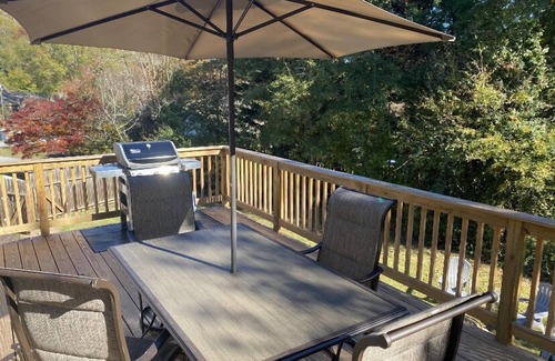 The BACKYARD is private and fully fenced. The upper deck has a gas grill and outdoor dining table and chairs. The lower patio area has a fire pit and string lights. Extra folding chairs are available for your convenience and we also have corn hole boards (and bags) for your use.
