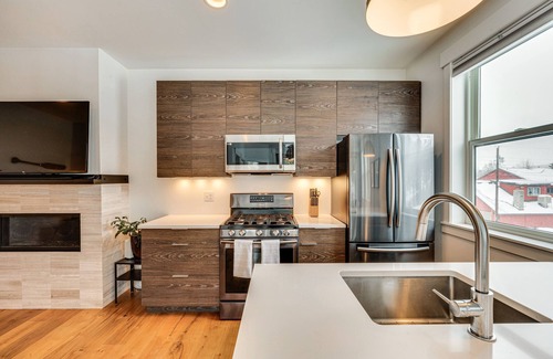 KITCHEN: Dishwasher, stove/oven, refrigerator, microwave, drip coffee maker, dishware + flatware, cooking basics, trash bags + paper towels, bar seating