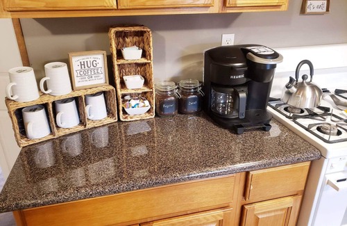 two other bedrooms with their own full bath, and an extra twin bed in the common area. Fully equipped kitchen for complete meal preparation and dining room for six. Smart TV boasts all of your popular streaming networks, just bring your own passwords. High speed wifi and full coffee bar are complimentary. Front and rear deck have seating and overlook the spacious yard. A bbq grill and grilling utensils are also provided. No pets, no smoking (home is pet dander free).