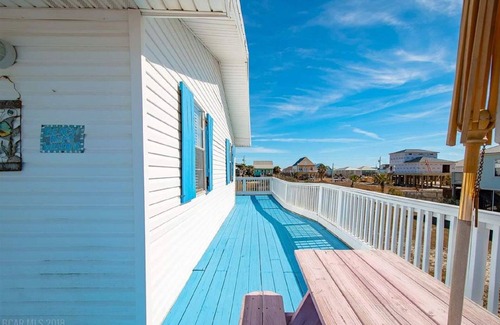 Newly renovated two bedroom, one bath home situated between the Gulf of Mexico and the Mobile Bay in Fort Morgan. Step off the deck and either walk two minutes the left to the ocean or two minutes to the right to the Bay! If your group wants to hang at the beach or fish or boat in the Bay then this is the perfect place to meet those needs! There are two private bedrooms. One room has one queen beds and the other has two double beds. There are two couches in the living room but they are not sleeper sofas. There is a full kitchen with full-sized appliances including a stove, refrigerator, microwave, & toaster oven. A full-sized washer and dryer is there as well. There is free WiFi and the living room has a 55” smart TV & both bedrooms have smart TV’s to watch all your favorite movies & tv shows. Local channels are available as well. The house has beautiful pine hardwood floors and tongue and groove wood on the ceilings. There is a nice, large deck that wraps to the side and has an outdoor sectional and excellent ocean or bay views! The lower area under the house has another picnic table and a swing to enjoy those ocean breezes. It's a pretty large area to just hang out and enjoy your down time! Tacky Jack's & The Sassy Bass are less than a 1/2 mile away and of course the historic Fort Morgan site is less than a mile away! You can catch the ferry there and head over to explore Dauphin Island for a unique day trip! Gulf Shores is just 15 minutes away! Enjoy the peace and solitude in Fort Morgan and head to Gulf Shores when you want to see the sites and visit the souvenir shops!