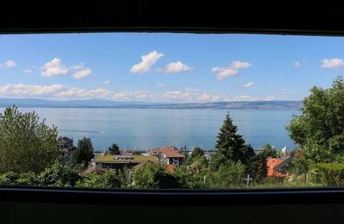 On the ground floor, this apartment near the city center (10 minutes walk) offers a superb view of the Leman Lake. The accommodation is an apartment on the ground floor of a detached house totally independent. It consists of a living room with sofa bed, a dining-room, a fully equipped kitchen, a bedroom with double bed, a bathroom with bath. The whole accommodation is dedicated to travelers with an independent entrance. Available to exchange with travelers, before, during and after. Residential area, free parking in the street. By boat, the pier with the boat to Lausanne is located at less than 1km. By train, the train station is located at about 2km. By car, free parking in front of the house. Non-smoking