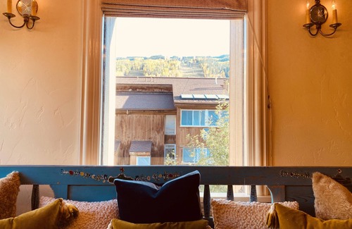 The kitchen gives way to the dining/living area via 4 antique bar stools that cozy up to the bar counter – they too were transplanted from another infamous drinking hole in southwest Colorado. The dining area offers views onto Vail mountain and is grounded by a beautiful farm table lit by both candles and an antique European chandelier. Bench seating accented with a host of comfy pillows allow for 8 to dine comfortably.