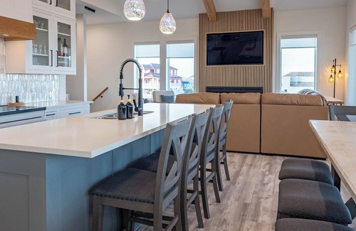 The décor balances **luxurious comfort with easy-going fun**. Expansive seating arrangements ensure the entire group can lounge together, watch movies, or simply enjoy the surf from the comfort of the living area.
