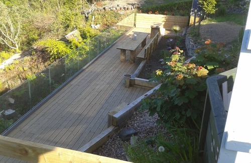 To the rear of the cottage is a decked terrace with views over the sea and coastline, perfect for dolphin spotting whilst enjoying a well earned sundowner after an exhilarating day on one of New Quay's three beaches, or messing about on the water,sailing, kayaking, stand up paddleboarding, fishing or taking one of the many dolphin watching or fishing boat trips all available in New Quay and a short walk from the cottage.