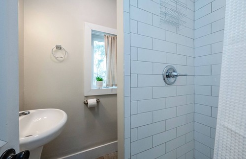 Cozy and romantic, nice space for a couple's getaway. Main floor bedroom has queen bed and updated bathroom with shower. Mini kitchen with microwave and fridge as well (no sink or stove). Dining area and study nook completes this unit.